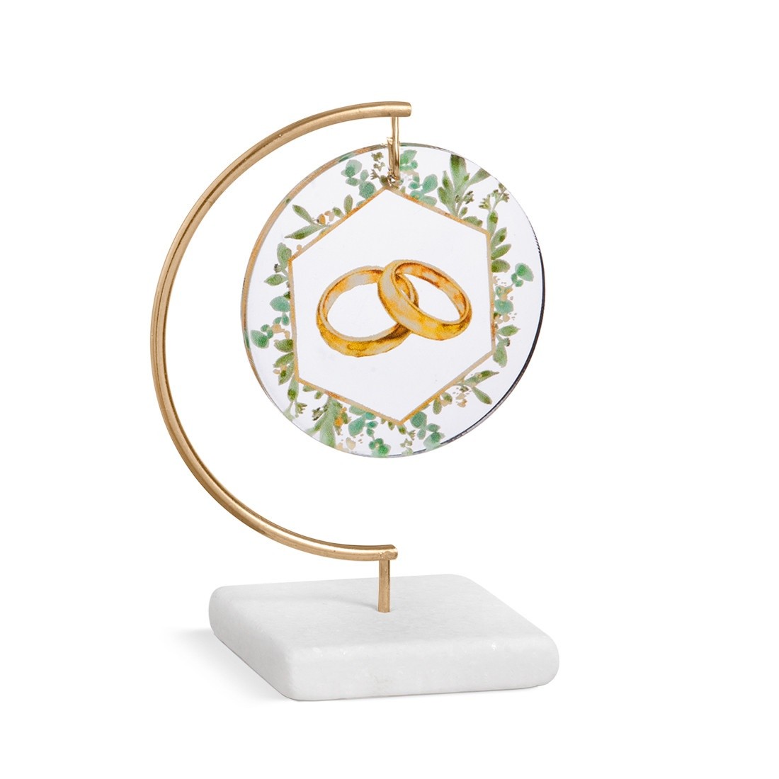 Διακοσμητική μπομπονιέρα με σύνθεση τριών υλικών.Η σύνθεση αποτελείται από : α) στρογγυλή print plexiglass παράσταση σε διάφανο χρώμα β) μεταλλικό κρίκο σε χρυσό χρώμα γ)βάση. Η παράσταση απεικονίζει χρυσές βέρες μέσα σε ένα στεφανάκι από πράσινο ευκάλυπτο.