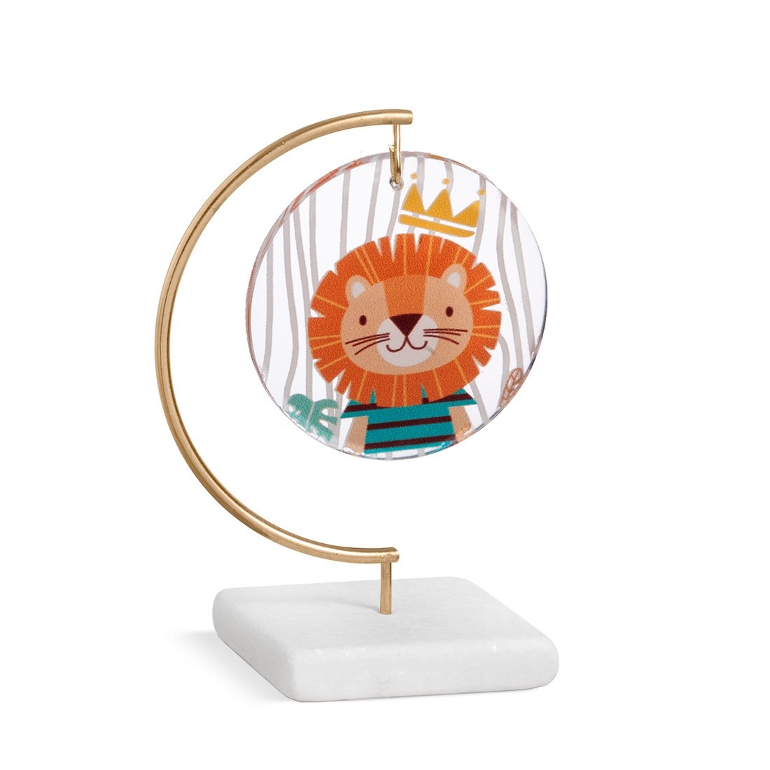 Διακοσμητική μπομπονιέρα με σύνθεση τριών υλικών.Η σύνθεση αποτελείται από : α) στρογγυλή print plexiglass παράσταση σε διάφανο χρώμα β) μεταλλικό κρίκο σε χρυσό χρώμα γ)βάση. Η παράσταση απεικονίζει το λιονταράκι ως "King of the jungle" .