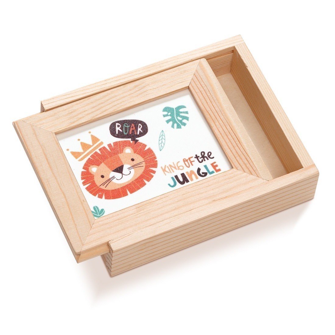 Ξύλινη κασετίνα με κορνίζα,Η κορνίζα είναι διακοσμημένη με παραλληλόγραμμο print plexiglass καδράκι σε λευκό χρώμα.Η παράσταση απεικονίζει σε οριζόντια μορφή το λιονταράκι ως "King of the jungle".