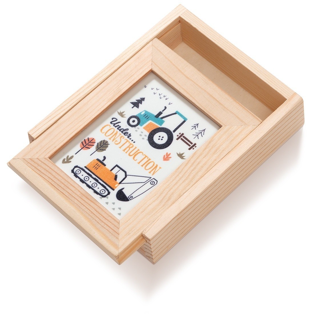 Ξύλινη κασετίνα με κορνίζα,Η κορνίζα είναι διακοσμημένη με παραλληλόγραμμο print plexiglass καδράκι σε λευκό χρώμα.Η παράσταση απεικονίζει σε κάθετη μορφή τον εκσκαφέα και το τρακτέρ.