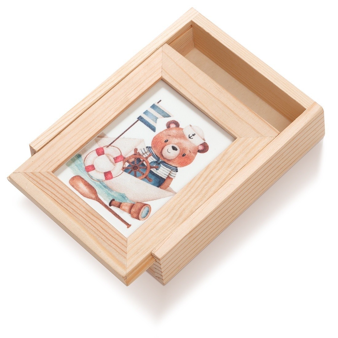 Ξύλινη κασετίνα με κορνίζα,Η κορνίζα είναι διακοσμημένη με παραλληλόγραμμο print plexiglass καδράκι σε λευκό χρώμα.Η παράσταση απεικονίζει σε κάθετη μορφή το αρκουδάκι ναυτάκι να αρμενίζει με τη βαρκούλα του.