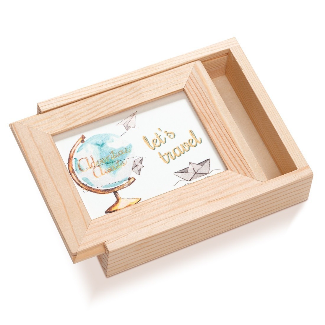 Ξύλινη κασετίνα με κορνίζα,Η κορνίζα είναι διακοσμημένη με παραλληλόγραμμο print plexiglass καδράκι σε λευκό χρώμα.Η παράσταση απεικονίζει σε οριζόντια μορφή την υδρόγειο και moto "Adventure Awaits".