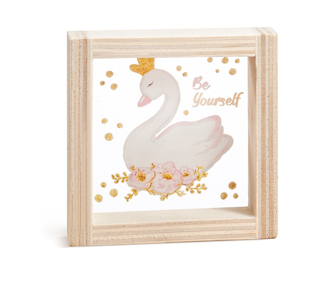 Ξύλινο καδράκι με print plexiglass παράσταση.Η παράσταση απεικονίζει σε διάφανο χρώμα τον κύκνο.