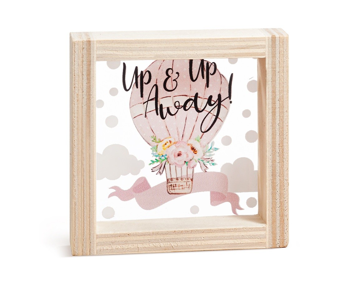 Ξύλινο καδράκι με print plexiglass παράσταση.Η παράσταση απεικονίζει σε διάφανο χρώμα το αερόστατο σε ροζ χρώμα και moto "up, up & away".