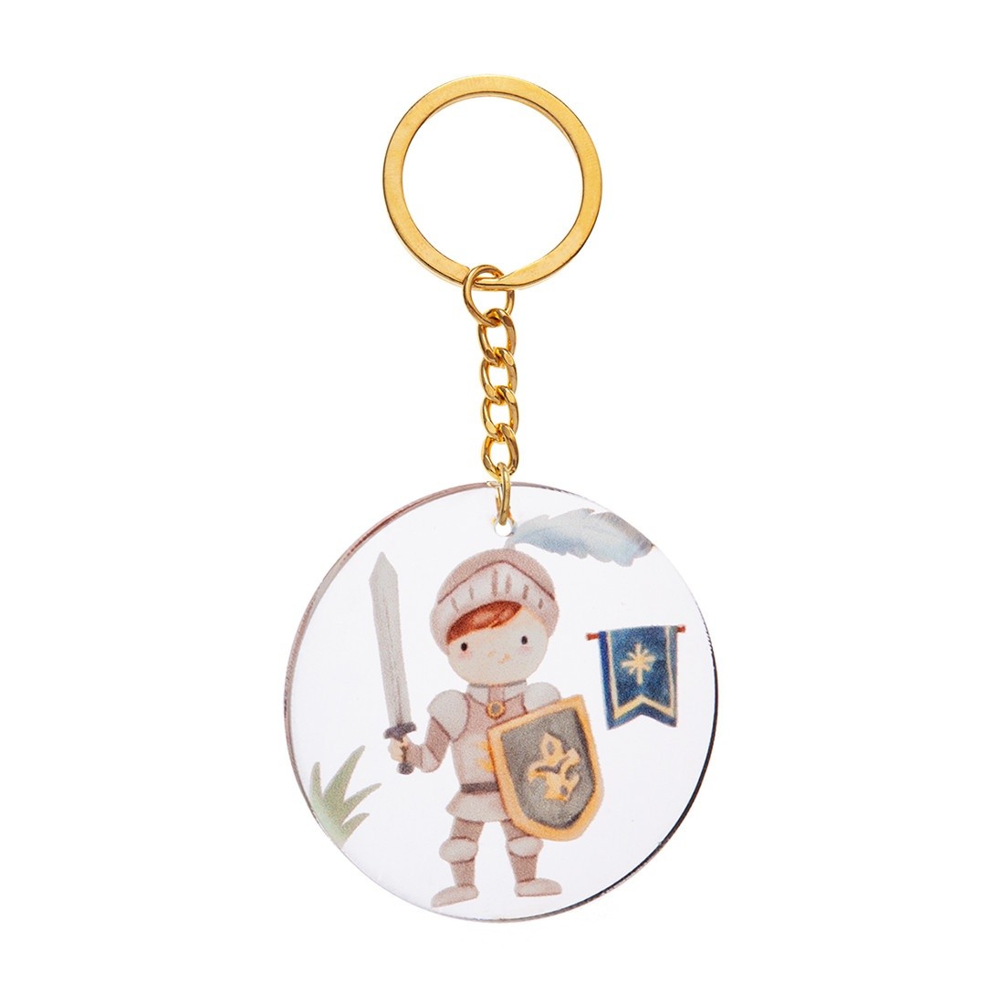 Μπρελόκ με στρογγυλή print παράσταση από plexiglass σε διάφανο χρώμα. Η παράσταση απεικονίζει τον ιππότη του παραμυθιού.