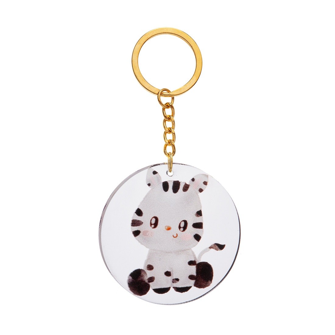 Μπρελόκ με στρογγυλή print παράσταση από plexiglass σε διάφανο χρώμα. Η παράσταση απεικονίζει μία baby ζέβρα.