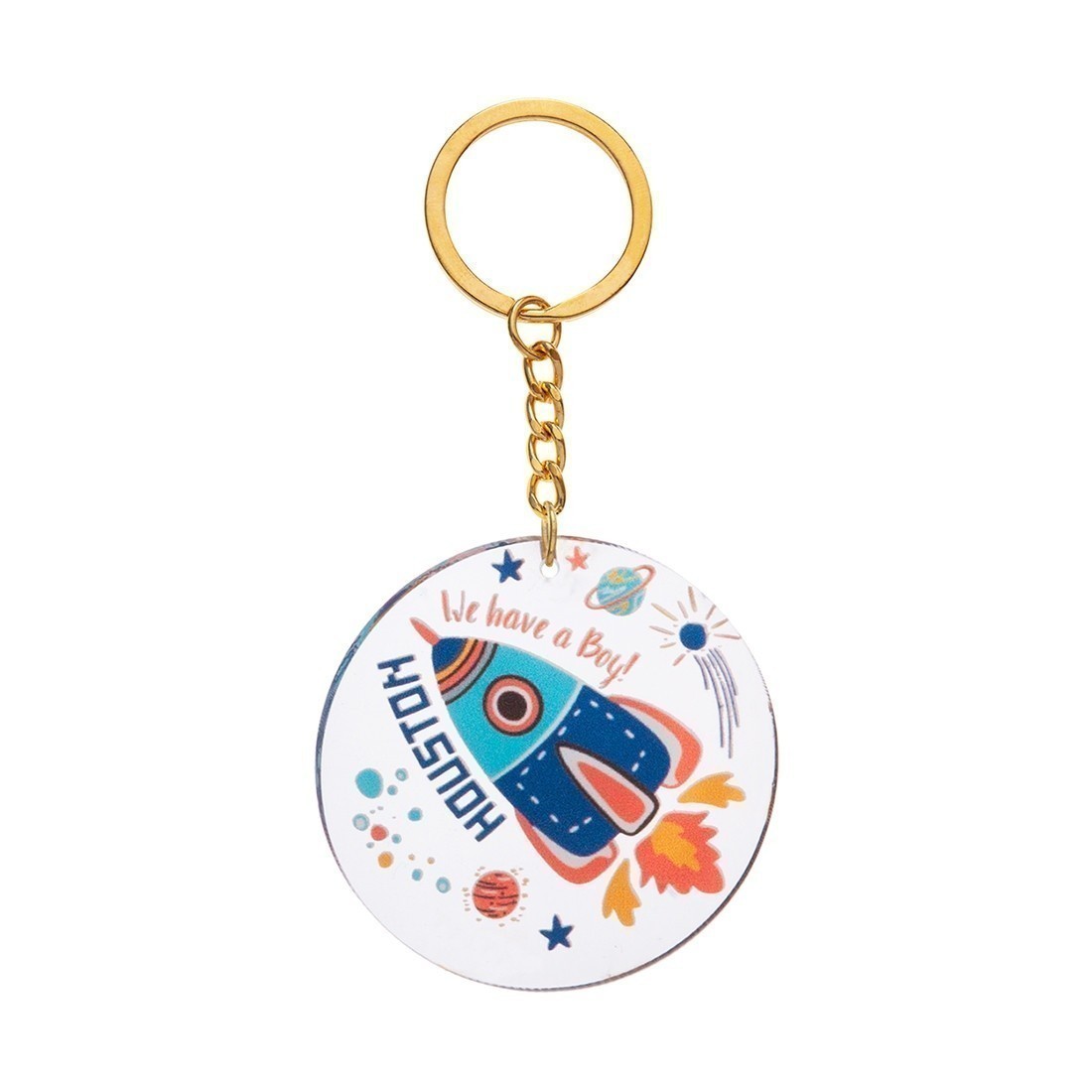 Μπρελόκ με στρογγυλή print παράσταση από plexiglass σε διάφανο χρώμα. Η παράσταση απεικονίζει τον πύραυλο να απογειώνεται και moto "Houston we have a boy".