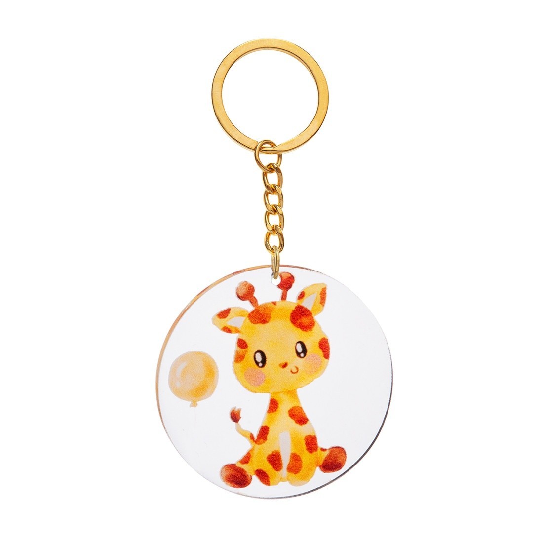 Μπρελόκ με στρογγυλή print παράσταση από plexiglass σε διάφανο χρώμα. Η παράσταση απεικονίζει μία baby καμηλοπάρδαλη.