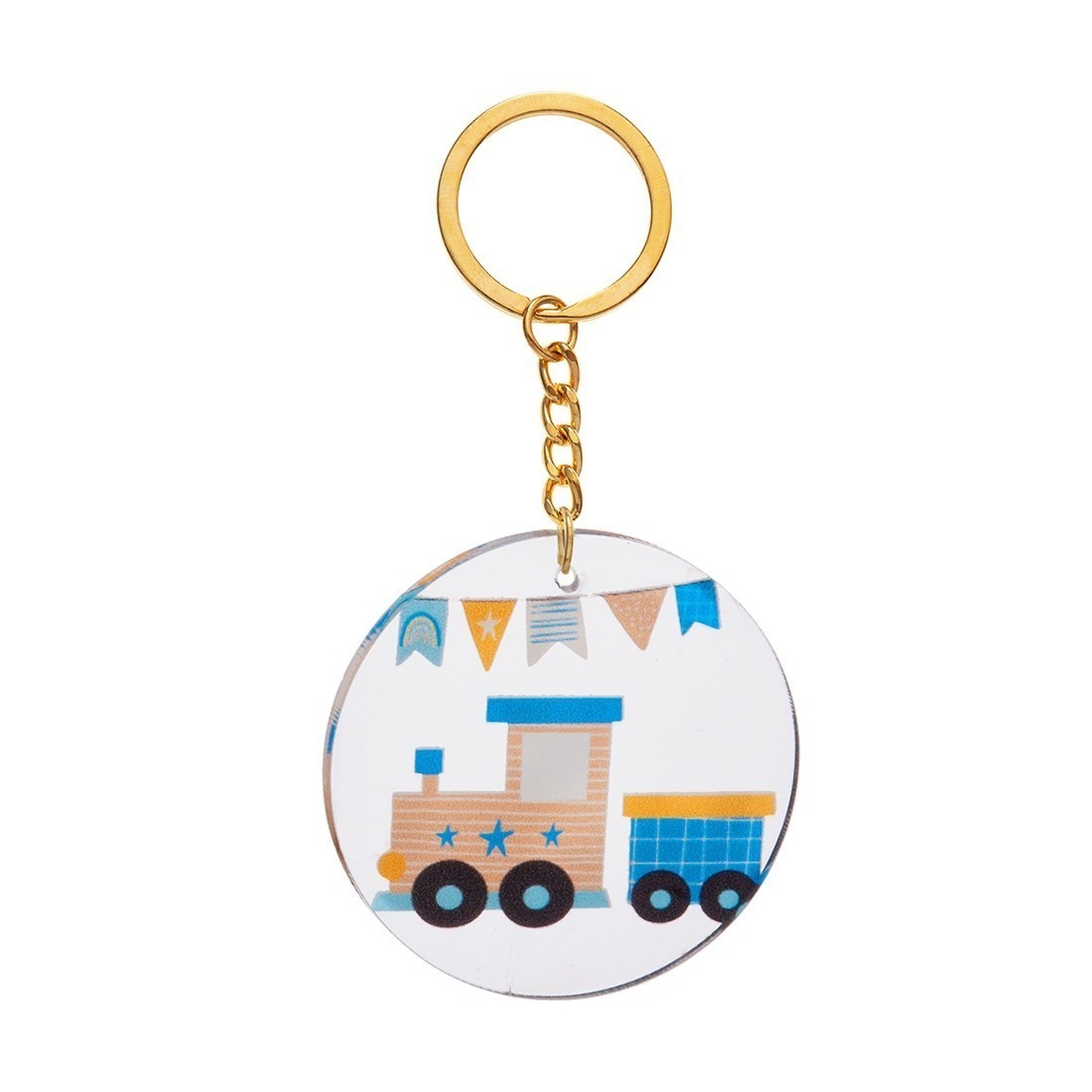 Μπρελόκ με στρογγυλή print παράσταση από plexiglass σε διάφανο χρώμα. Η παράσταση απεικονίζει το τρενάκι σε σιέλ αποχρώσεις .