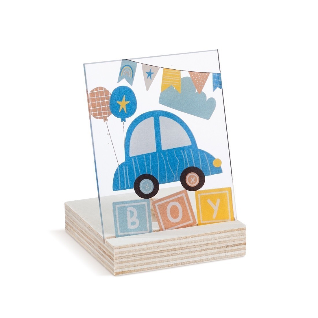 Ξύλινο ρεσό με παραλληλόγραμμο print καδράκι σε διάφανο plexiglass. Η παράσταση απεικονίζει ένα παιδικό αυτοκινητάκι σε σιέλ αποχρώσεις.