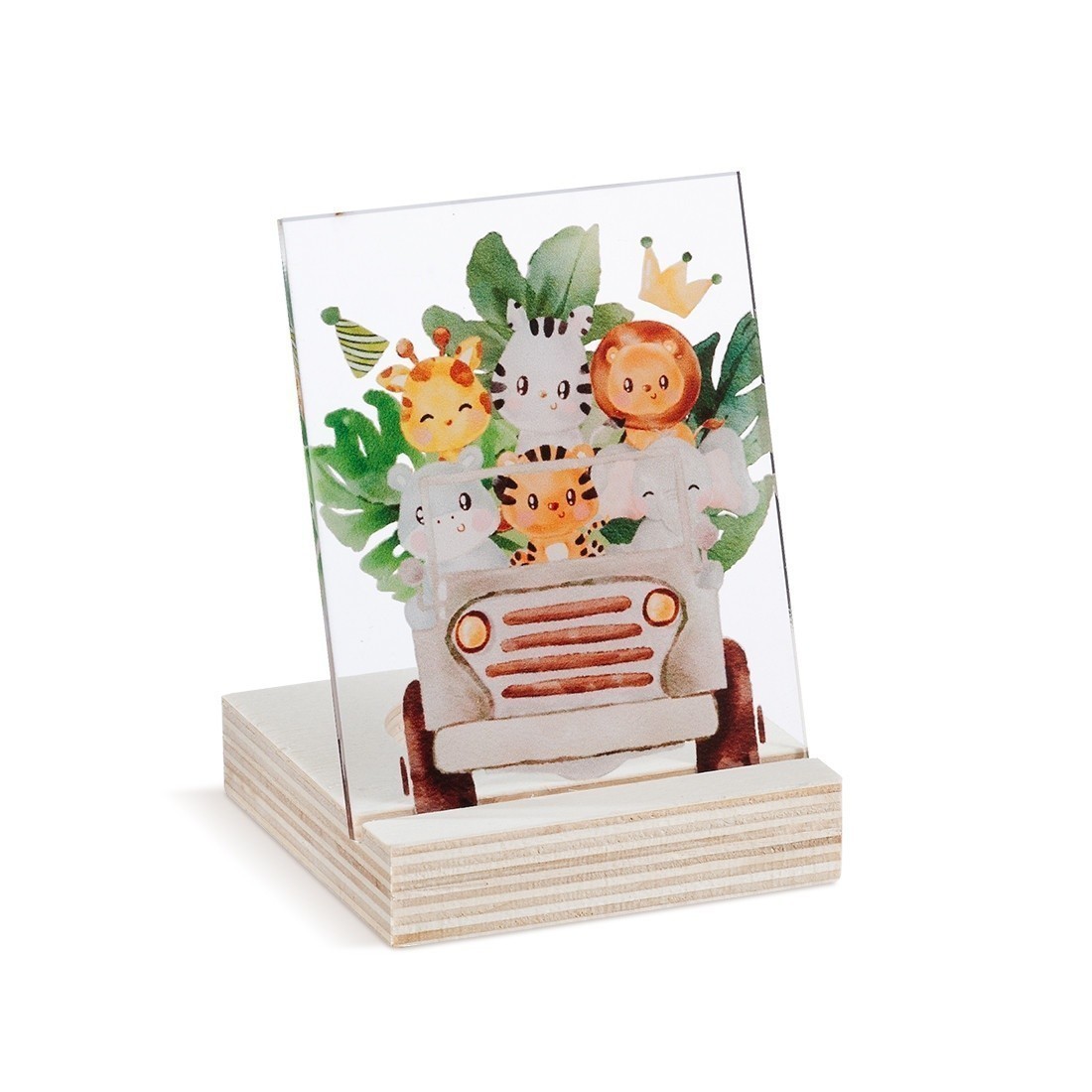 Ξύλινο ρεσό με παραλληλόγραμμο print καδράκι σε διάφανο plexiglass. Η παράσταση απεικονίζει τα ζωάκια της ζούγκλας να πηγαίνουν για safari.