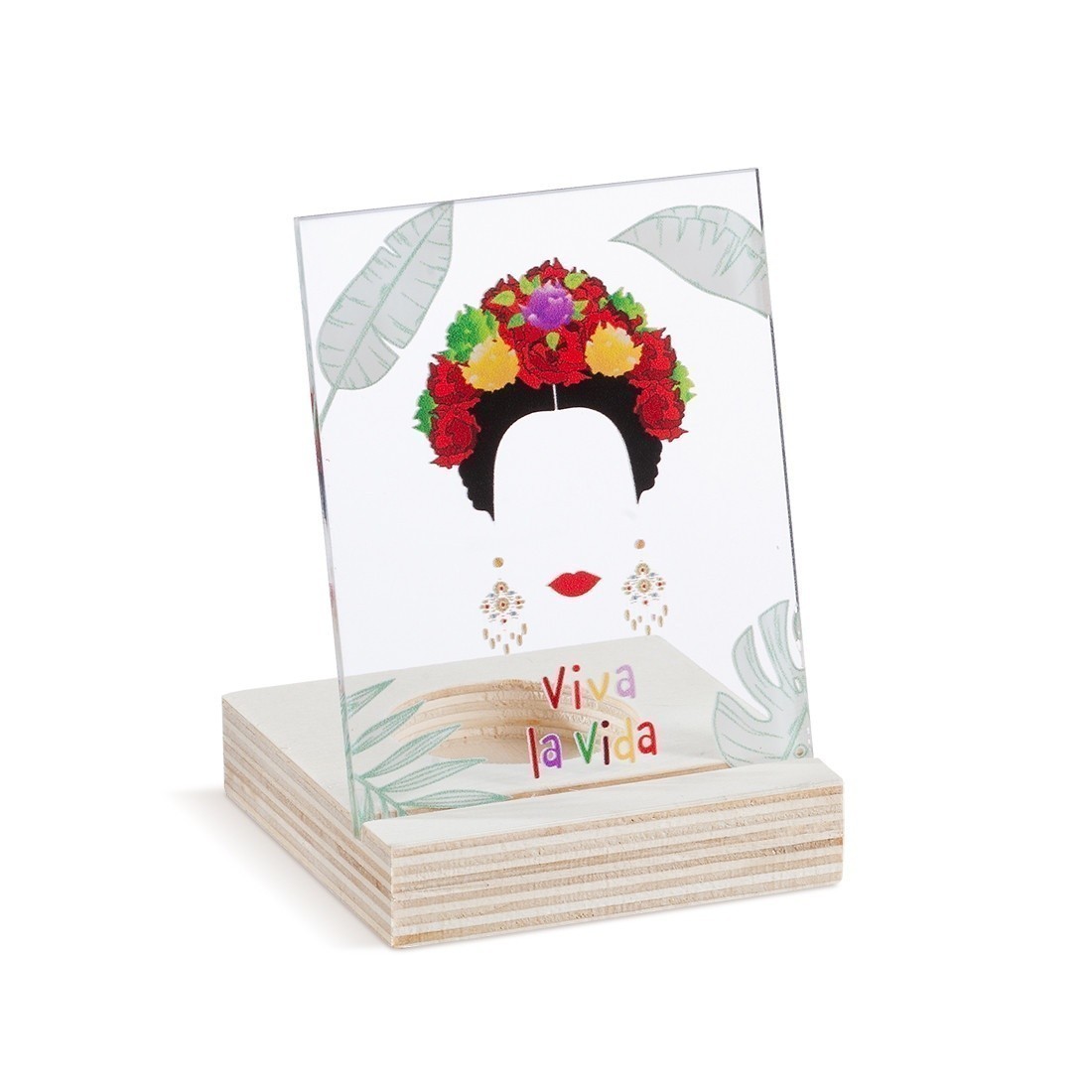 Ξύλινο ρεσό με παραλληλόγραμμο print καδράκι σε διάφανο plexiglass. Η παράσταση απεικονίζει την Frida Khalo και moto " Viva la vida".