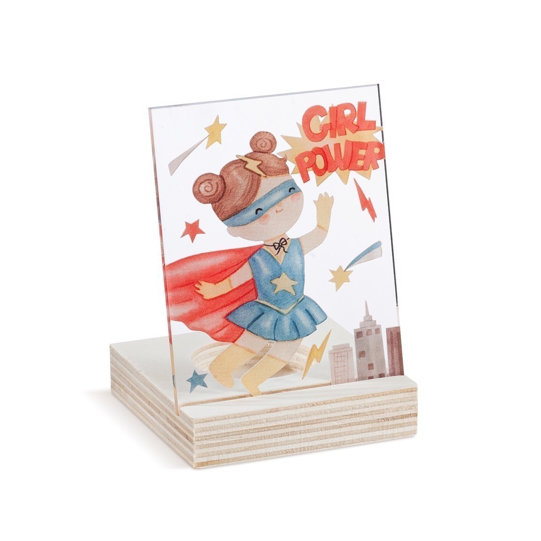 Ξύλινο ρεσό με παραλληλόγραμμο print καδράκι σε διάφανο plexiglass. Η παράσταση απεικονίζει την Super Girl power.