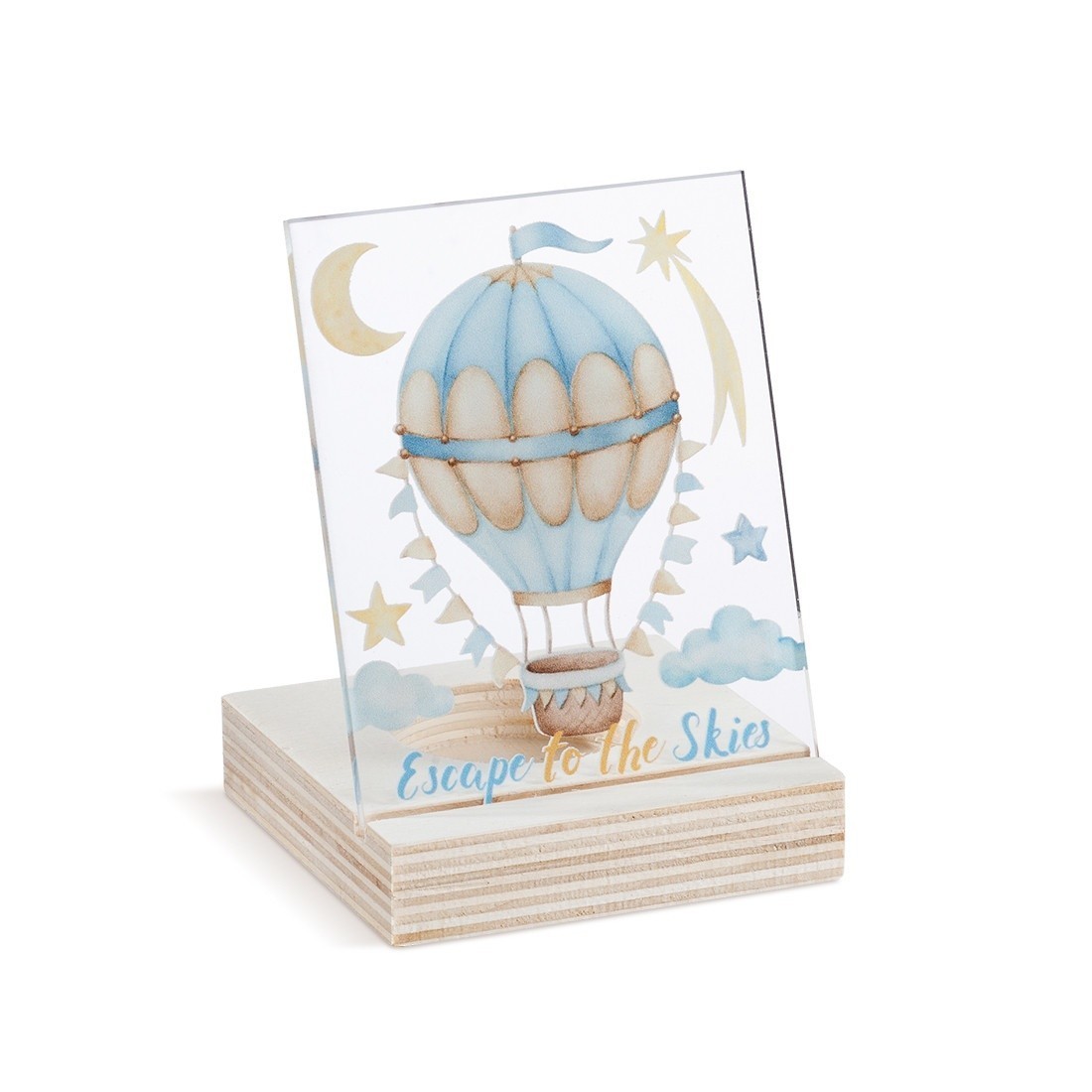 Ξύλινο ρεσό με παραλληλόγραμμο print καδράκι σε διάφανο plexiglass. Η παράσταση απεικονίζει το αερόστατο σε σιέλ αποχρώσεις δίνοντας το σύνθημα " Escape to the skies".