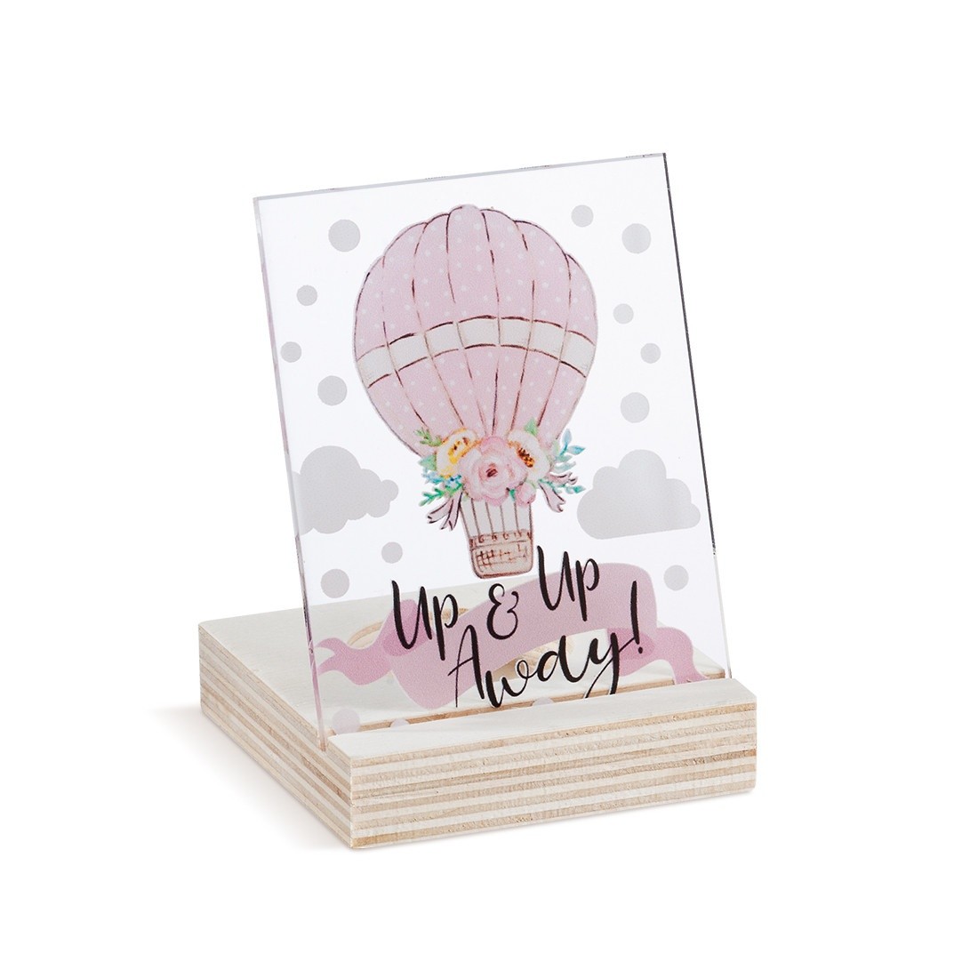 Ξύλινο ρεσό με παραλληλόγραμμο print καδράκι σε διάφανο plexiglass. Η παράσταση απεικονίζει το αερόστατο σε ροζ χρώμα και moto "up, up & away".