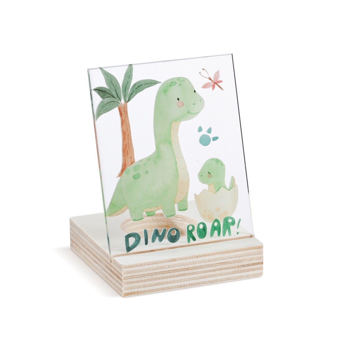 Ξύλινο ρεσό με παραλληλόγραμμο print καδράκι σε διάφανο plexiglass. Η παράσταση απεικονίζει τον Dino το δεινοσαυράκι με φόντο το ηφαίστειο.