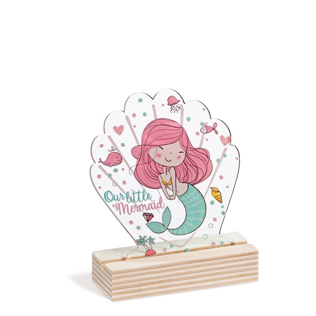 Ξύλινη βάση με print plexiglass κοπτικό. Η παράσταση απεικονίζει σε διάφανο χρώμα την γοργόνα .