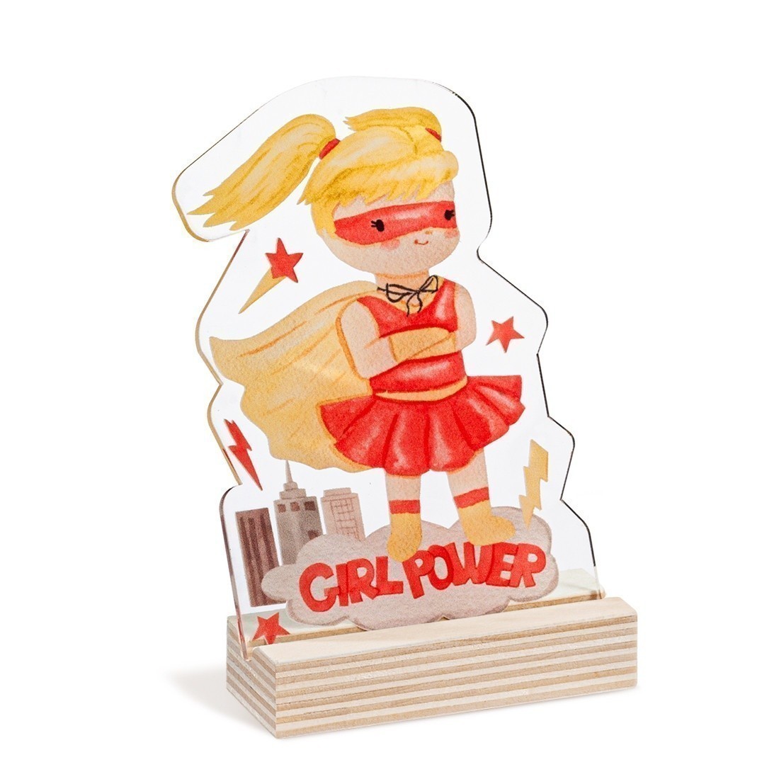 Ξύλινη βάση με print plexiglass κοπτικό. Η παράσταση απεικονίζει σε διάφανο χρώμα την Super Girl power.