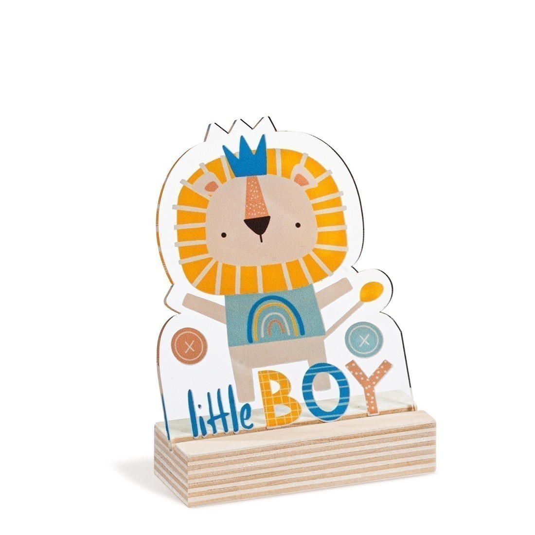 Ξύλινη βάση με print plexiglass κοπτικό. Η παράσταση απεικονίζει σε διάφανο χρώμα ένα λιονταράκι σε σιέλ αποχρώσεις.