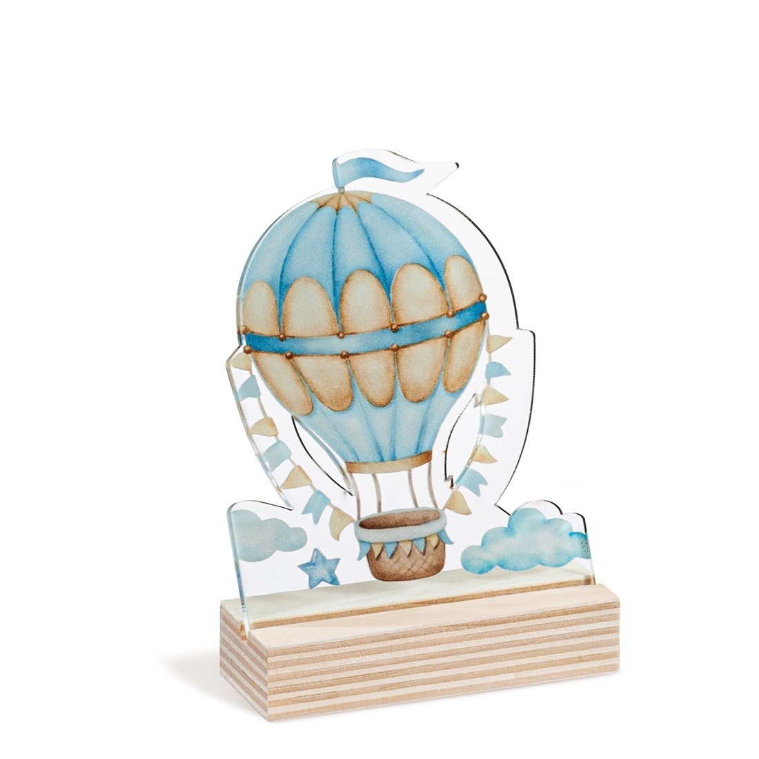 Ξύλινη βάση με print plexiglass κοπτικό. Η παράσταση απεικονίζει σε διάφανο χρώμα το αερόστατο σε σιέλ αποχρώσεις.