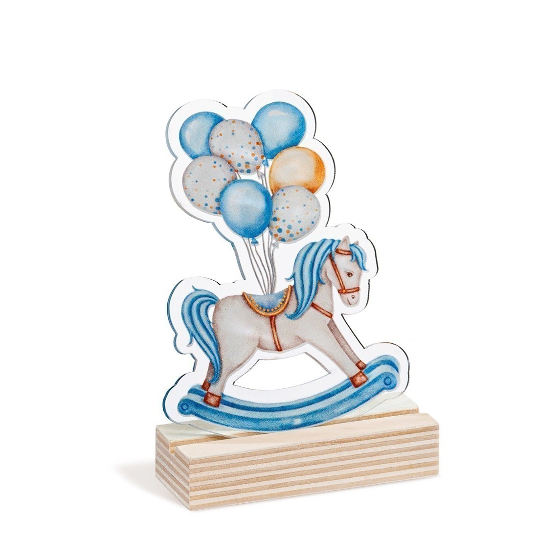 Ξύλινη βάση με print plexiglass κοπτικό. Η παράσταση απεικονίζει σε διάφανο χρώμα ένα σιελ αλογάκι με μπαλόνια.