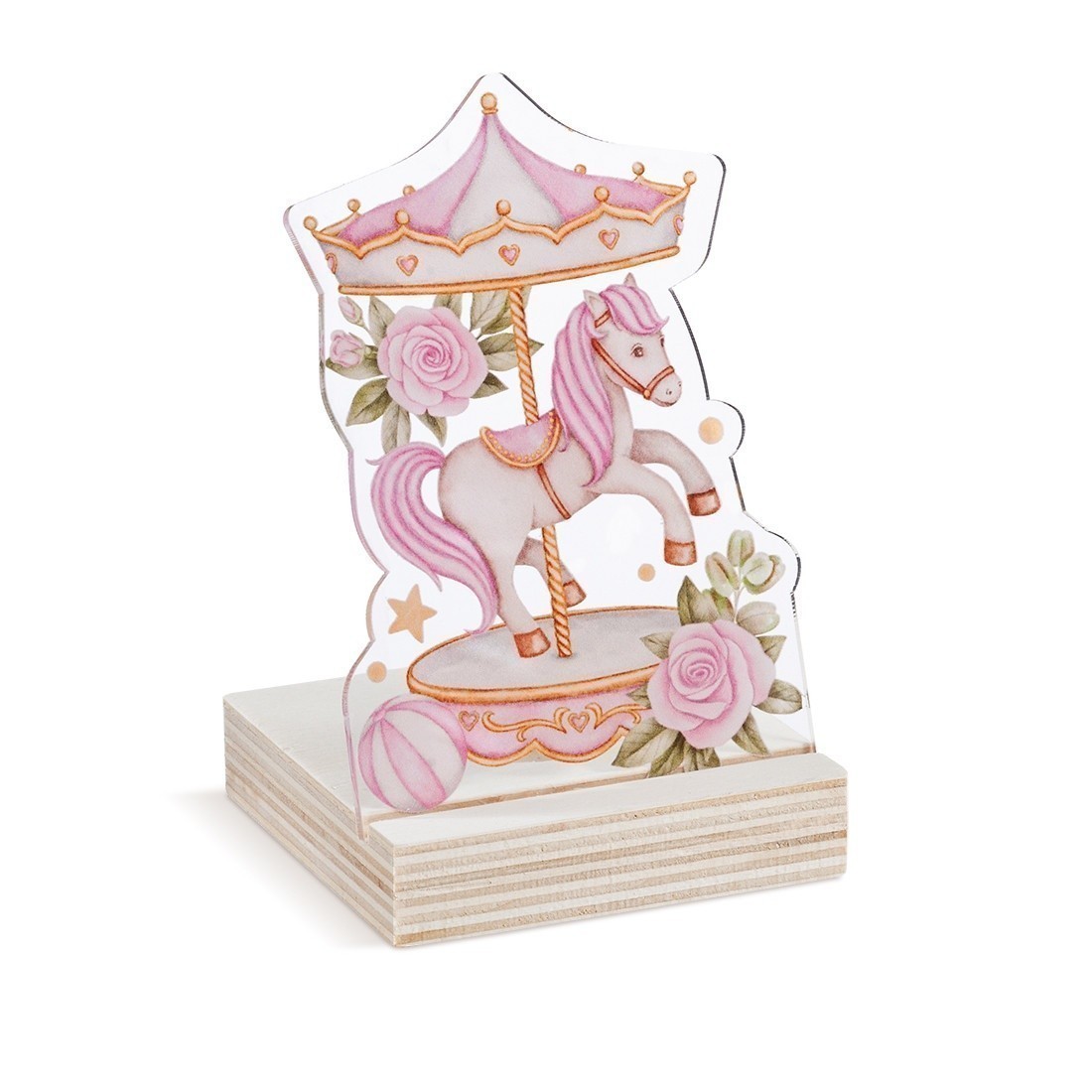 Ξύλινη βάση ρεσώ με print plexiglass κοπτικό. Η παράσταση απεικονίζει σε διάφανο χρώμα ένα ροζ καρουζέλ.