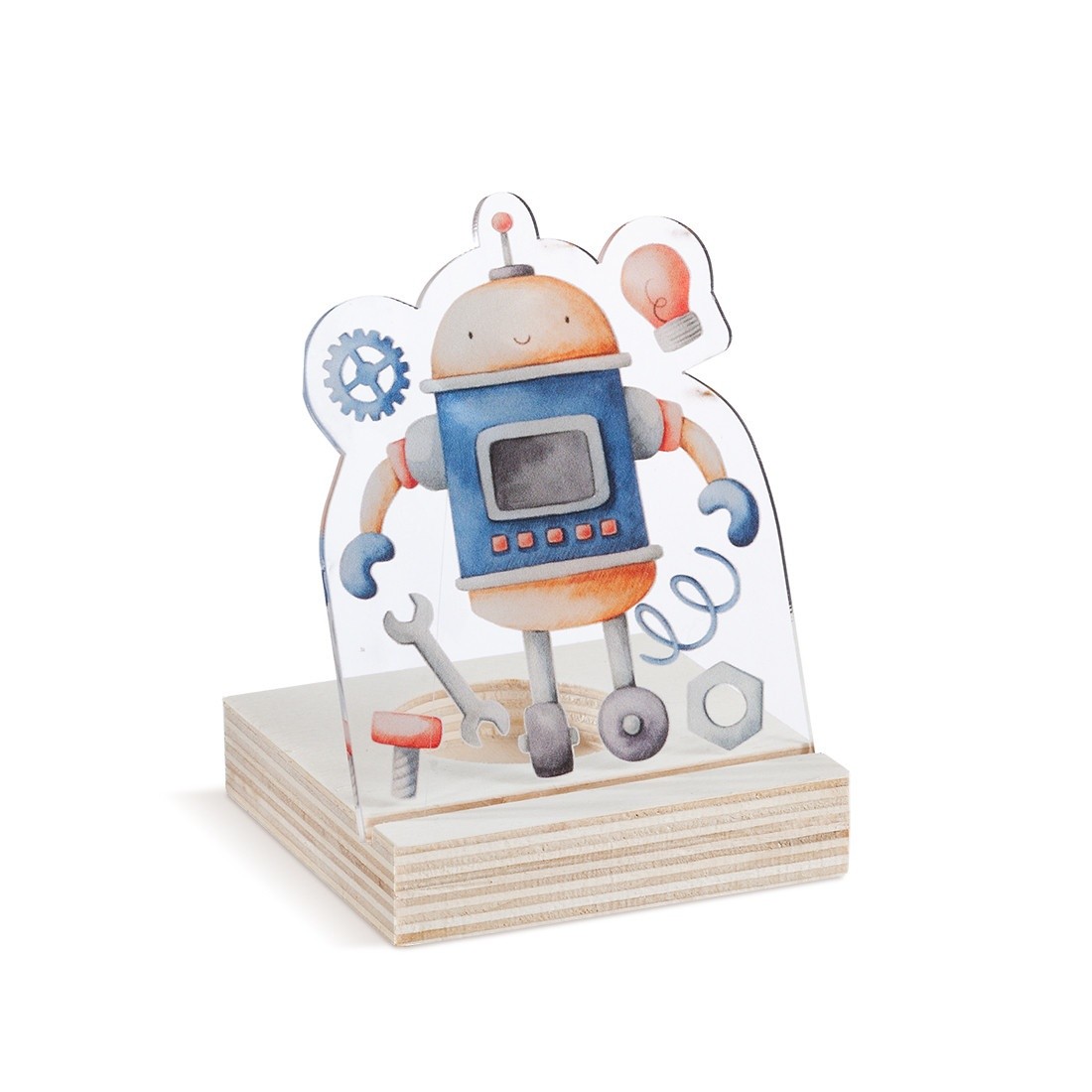 Ξύλινη βάση ρεσώ με print plexiglass κοπτικό. Η παράσταση απεικονίζει σε διάφανο χρώμα ένα ρομπότ με φόντο διάφορα εργαλεία .