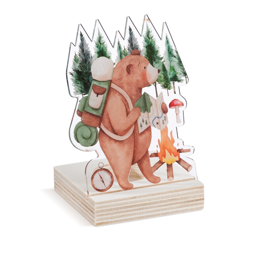 Ξύλινη βάση ρεσώ με print plexiglass κοπτικό. Η παράσταση απεικονίζει σε διάφανο χρώμα την αρκούδα να πηγαίνει για camping .