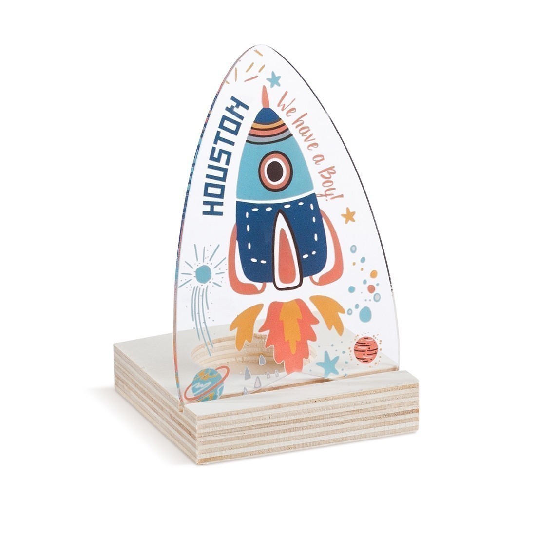 Ξύλινη βάση ρεσώ με print plexiglass κοπτικό. Η παράσταση απεικονίζει σε διάφανο χρώμα τον πύραυλο να απογειώνεται και moto "Houston we have a boy" .