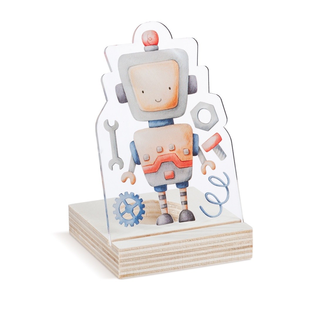 Ξύλινη βάση ρεσώ με print plexiglass κοπτικό. Η παράσταση απεικονίζει σε διάφανο χρώμα ένα ρομπότ με φόντο διάφορα εργαλεία.