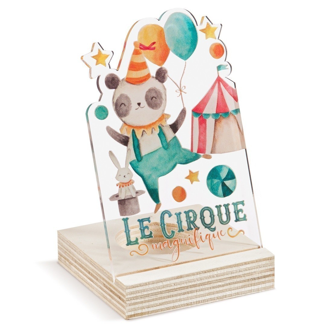 Ξύλινη βάση ρεσώ με print plexiglass κοπτικό. Η παράσταση απεικονίζει σε διάφανο χρώμα το panda να κάνει ακροβατικά με φόντο τη σκηνή του τσίρκου .