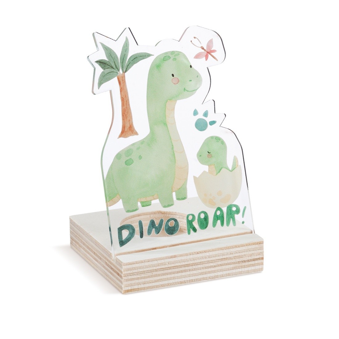 Ξύλινη βάση ρεσώ με print plexiglass κοπτικό. Η παράσταση απεικονίζει σε διάφανο χρώμα τον Dino το δεινοσαυράκι με φόντο το ηφαίστειο .