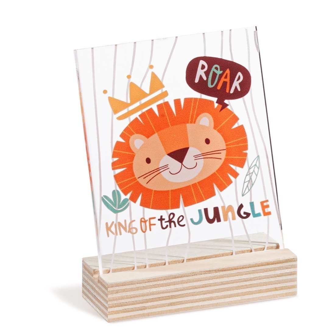 Ξύλινη βάση με παραλληλόγραμμο print καδράκι σε διάφανο plexiglass. Η παράσταση απεικονίζει το λιονταράκι ως "King of the jungle".