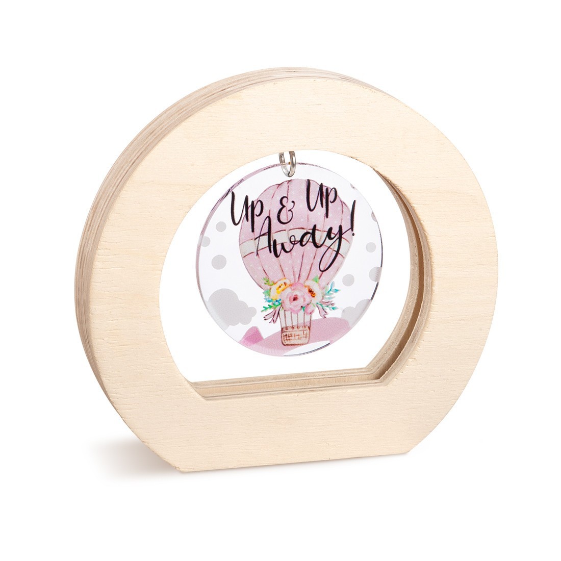 Ξύλινο οβάλ καδράκι σε natural χρώμα. Το εσωτερικό είναι διακοσμημένο με κρεμαστή plexiglass print παράσταση σε στρογγυλό σχήμα με θέμα ένα ροζ αερόστατο και μότο" up, up and away!".