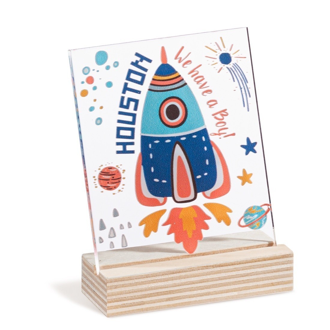 Ξύλινη βάση με παραλληλόγραμμο print καδράκι σε διάφανο plexiglass. Η παράσταση απεικονίζει τον πύραυλο να απογειώνεται και moto "Houston we have a boy".