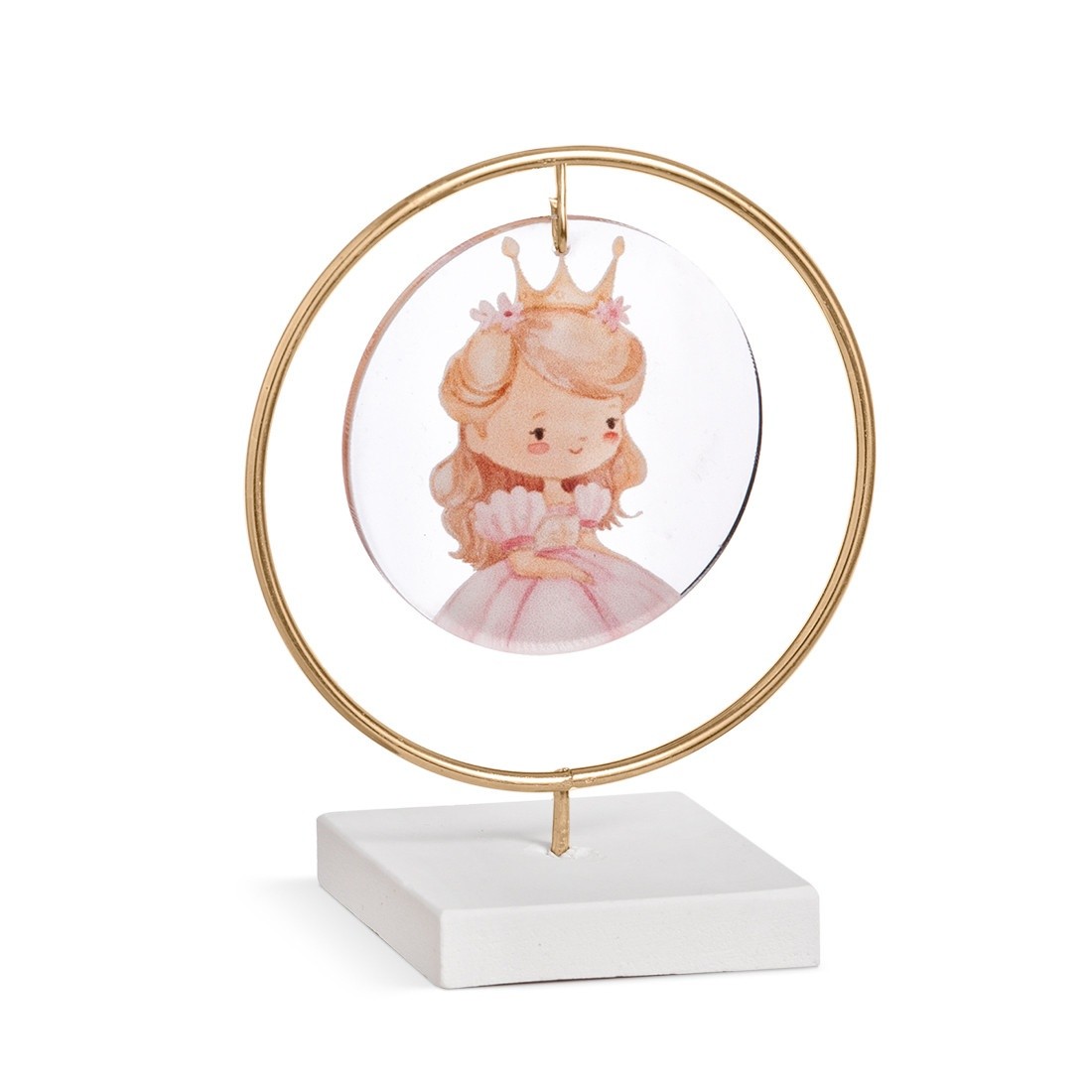 Διακοσμητική μπομπονιέρα με σύνθεση τριών υλικών.Η σύνθεση αποτελείται από : α) στρογγυλή print plexiglass παράσταση σε διάφανο χρώμα β) μεταλλικό κρίκο σε χρυσό χρώμα γ)βάση. Η παράσταση απεικονίζει την πριγκίπισσα του παραμυθιού .