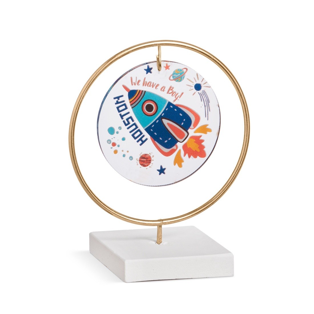 Διακοσμητική μπομπονιέρα με σύνθεση τριών υλικών.Η σύνθεση αποτελείται από : α) στρογγυλή print plexiglass παράσταση σε διάφανο χρώμα β) μεταλλικό κρίκο σε χρυσό χρώμα γ)βάση. Η παράσταση απεικονίζει τον πύραυλο να απογειώνεται και moto "Houston we have a boy" .