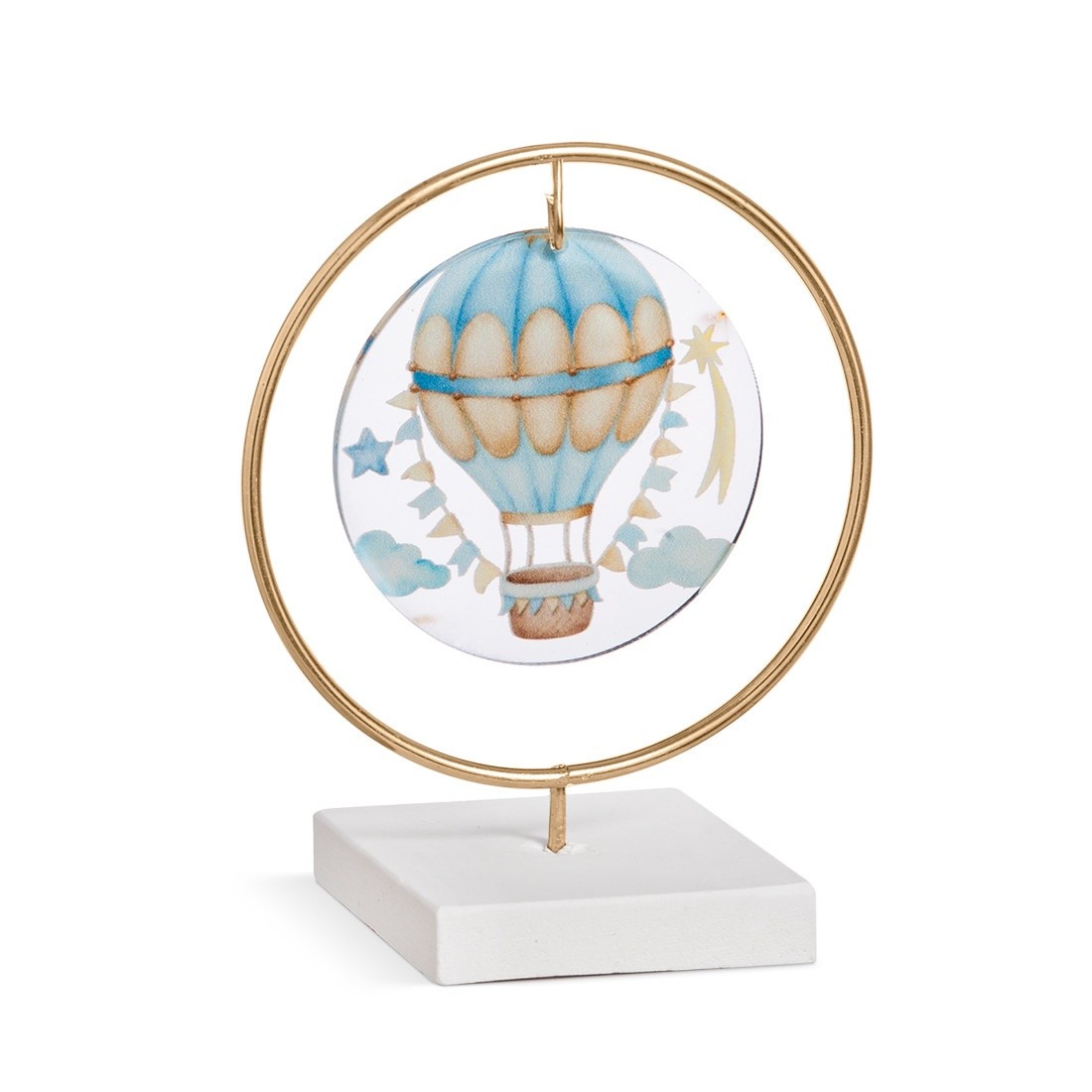 Διακοσμητική μπομπονιέρα με σύνθεση τριών υλικών.Η σύνθεση αποτελείται από : α) στρογγυλή print plexiglass παράσταση σε διάφανο χρώμα β) μεταλλικό κρίκο σε χρυσό χρώμα γ)βάση. Η παράσταση απεικονίζει το αερόστατο σε σιέλ αποχρώσεις .