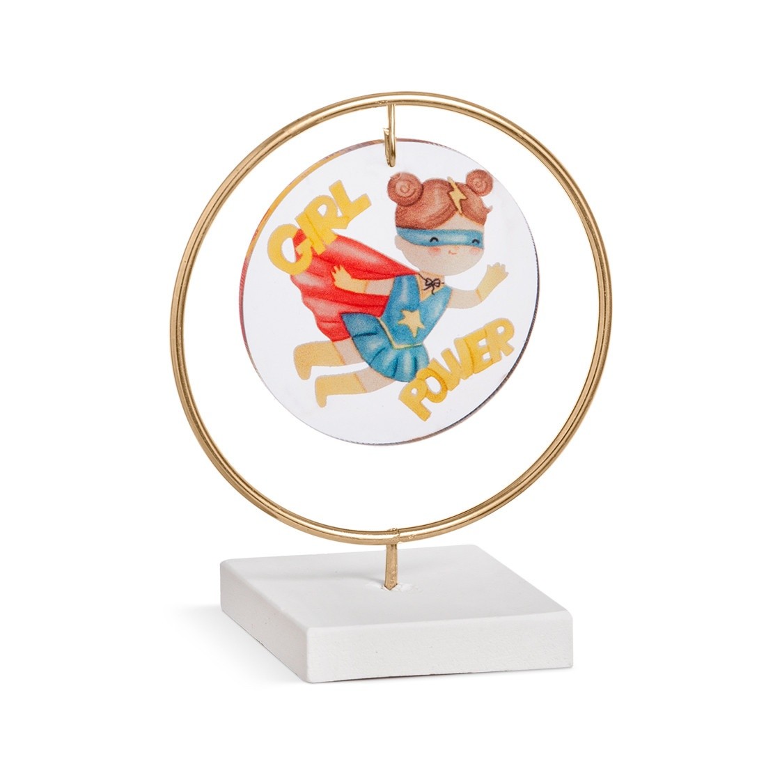 Διακοσμητική μπομπονιέρα με σύνθεση τριών υλικών.Η σύνθεση αποτελείται από : α) στρογγυλή print plexiglass παράσταση σε διάφανο χρώμα β) μεταλλικό κρίκο σε χρυσό χρώμα γ)βάση. Η παράσταση απεικονίζει την Super Girl power.