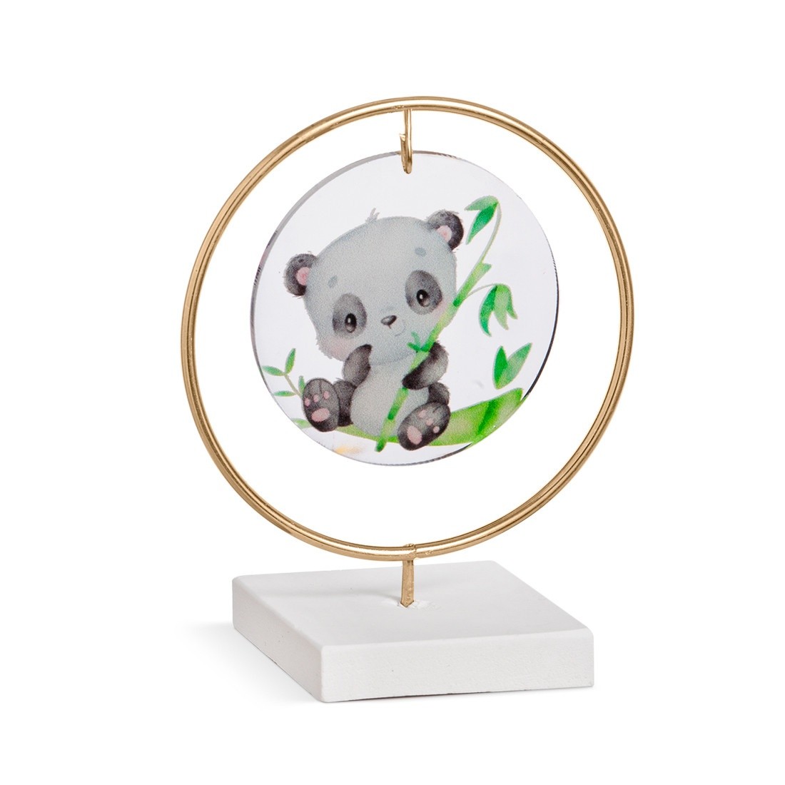 Διακοσμητική μπομπονιέρα με σύνθεση τριών υλικών.Η σύνθεση αποτελείται από : α) στρογγυλή print plexiglass παράσταση σε διάφανο χρώμα β) μεταλλικό κρίκο σε χρυσό χρώμα γ)βάση. Η παράσταση απεικονίζει την κλασσική φιγούρα του panda με τον ευκάλυπτο .