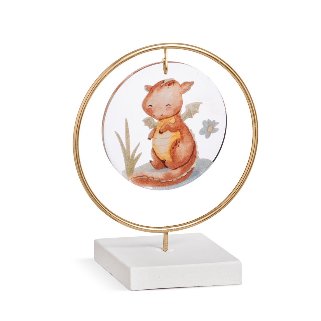 Διακοσμητική μπομπονιέρα με σύνθεση τριών υλικών.Η σύνθεση αποτελείται από : α) στρογγυλή print plexiglass παράσταση σε διάφανο χρώμα β) μεταλλικό κρίκο σε χρυσό χρώμα γ)βάση. Η παράσταση απεικονίζει τον δράκο του παραμυθιού .