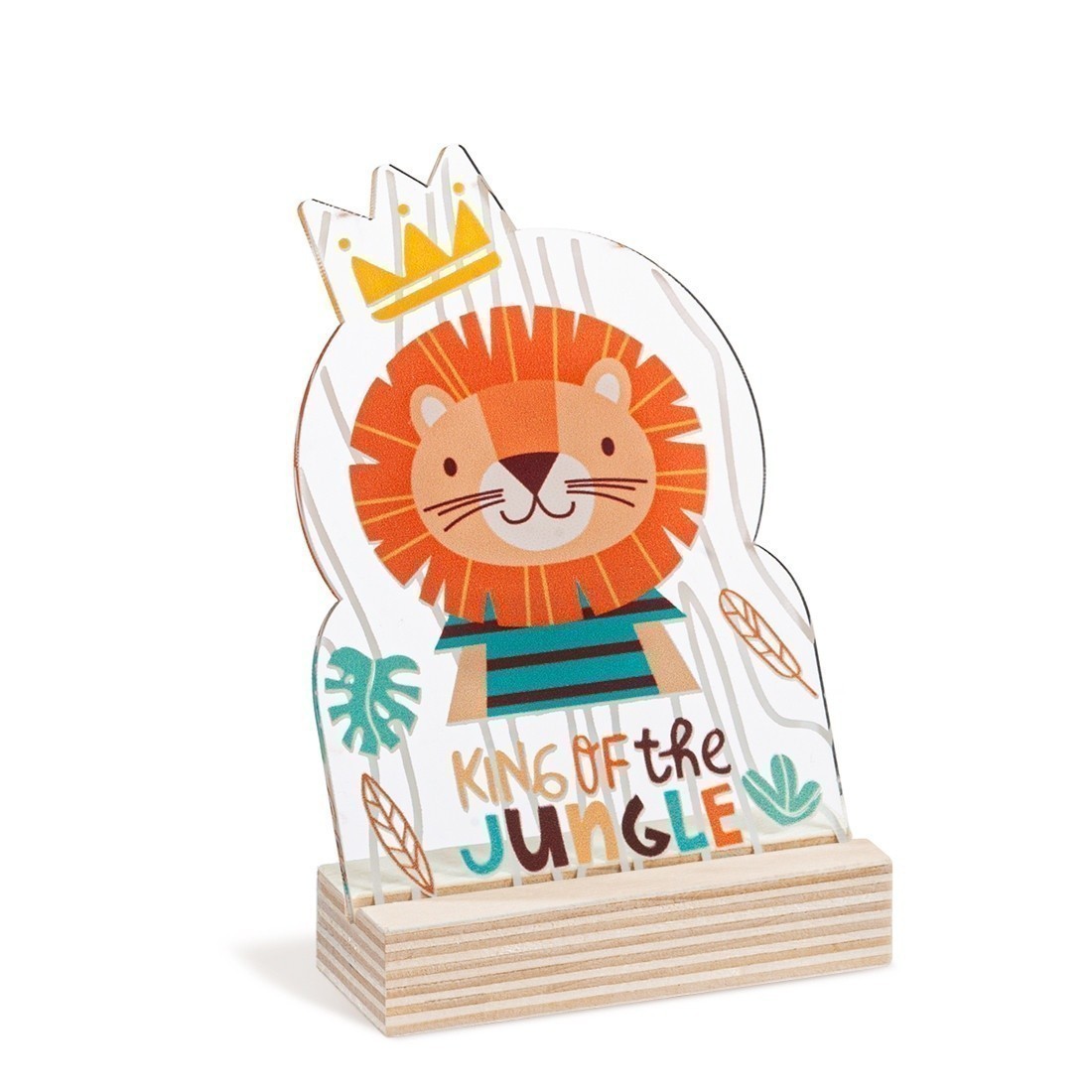 Ξύλινη βάση με print plexiglass κοπτικό. Η παράσταση απεικονίζει σε διάφανο χρώμα το λιονταράκι ως "King of the jungle".