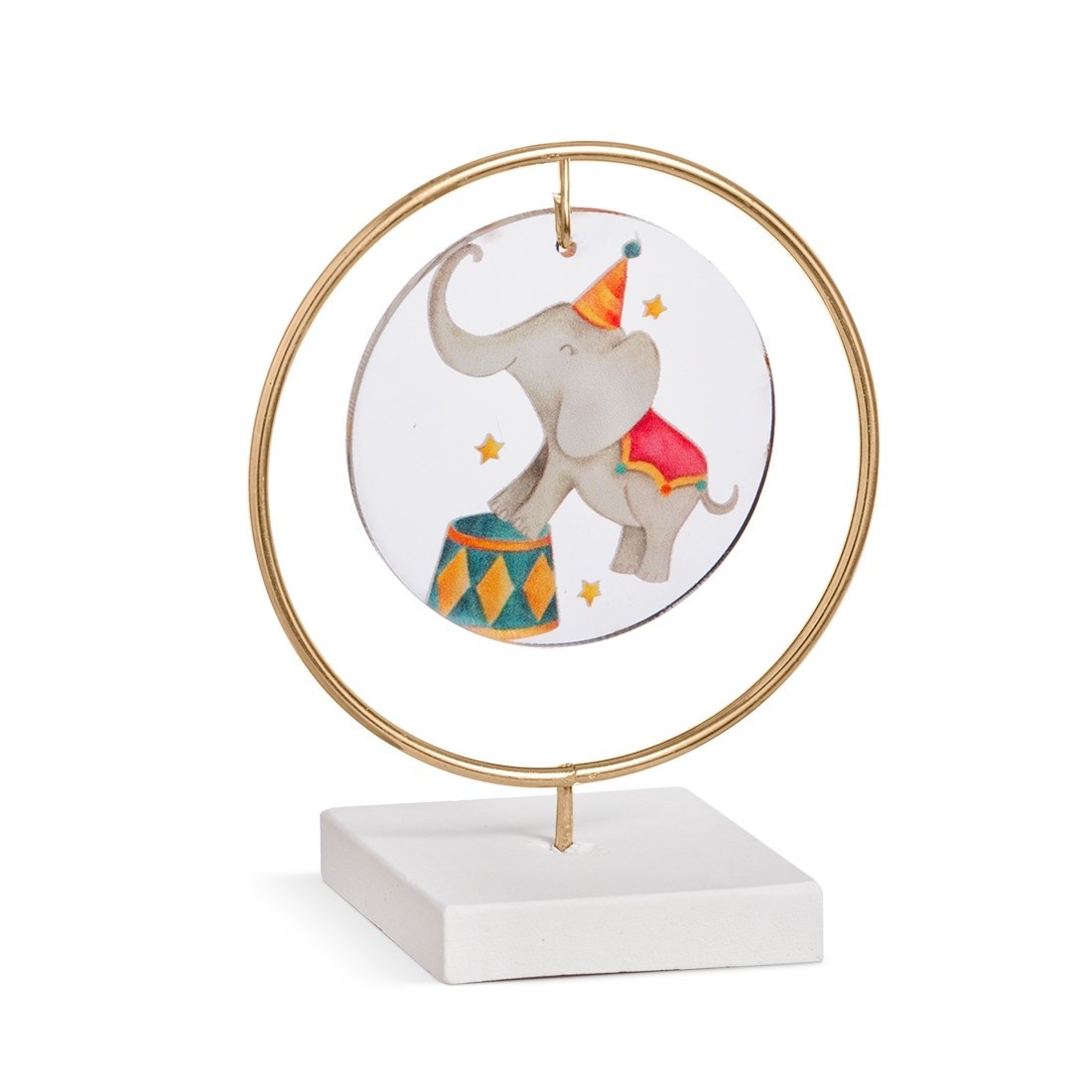 Διακοσμητική μπομπονιέρα με σύνθεση τριών υλικών.Η σύνθεση αποτελείται από : α) στρογγυλή print plexiglass παράσταση σε διάφανο χρώμα β) μεταλλικό κρίκο σε χρυσό χρώμα γ)βάση. Η παράσταση απεικονίζει τον ελέφαντα να κάνει ακροβατικά στο τσίρκο .