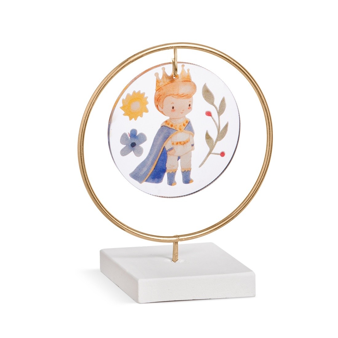 Διακοσμητική μπομπονιέρα με σύνθεση τριών υλικών.Η σύνθεση αποτελείται από : α) στρογγυλή print plexiglass παράσταση σε διάφανο χρώμα β) μεταλλικό κρίκο σε χρυσό χρώμα γ)βάση. Η παράσταση απεικονίζει τον πρίγκιππα του παραμυθιού .