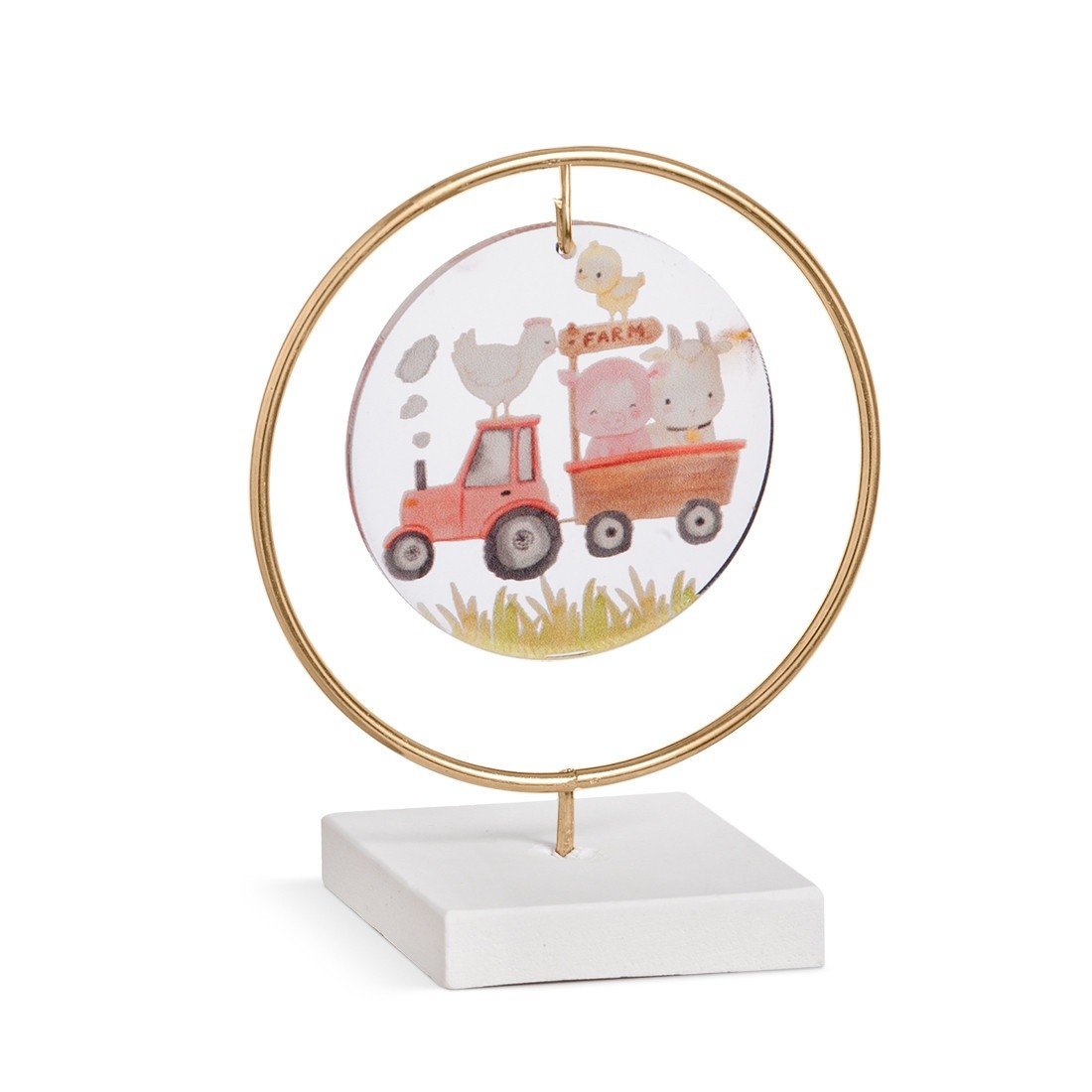 Διακοσμητική μπομπονιέρα με σύνθεση τριών υλικών.Η σύνθεση αποτελείται από : α) στρογγυλή print plexiglass παράσταση σε διάφανο χρώμα β) μεταλλικό κρίκο σε χρυσό χρώμα γ)βάση. Η παράσταση απεικονίζει ένα τρακτέρ γεμάτο ζωάκια της φάρμας .