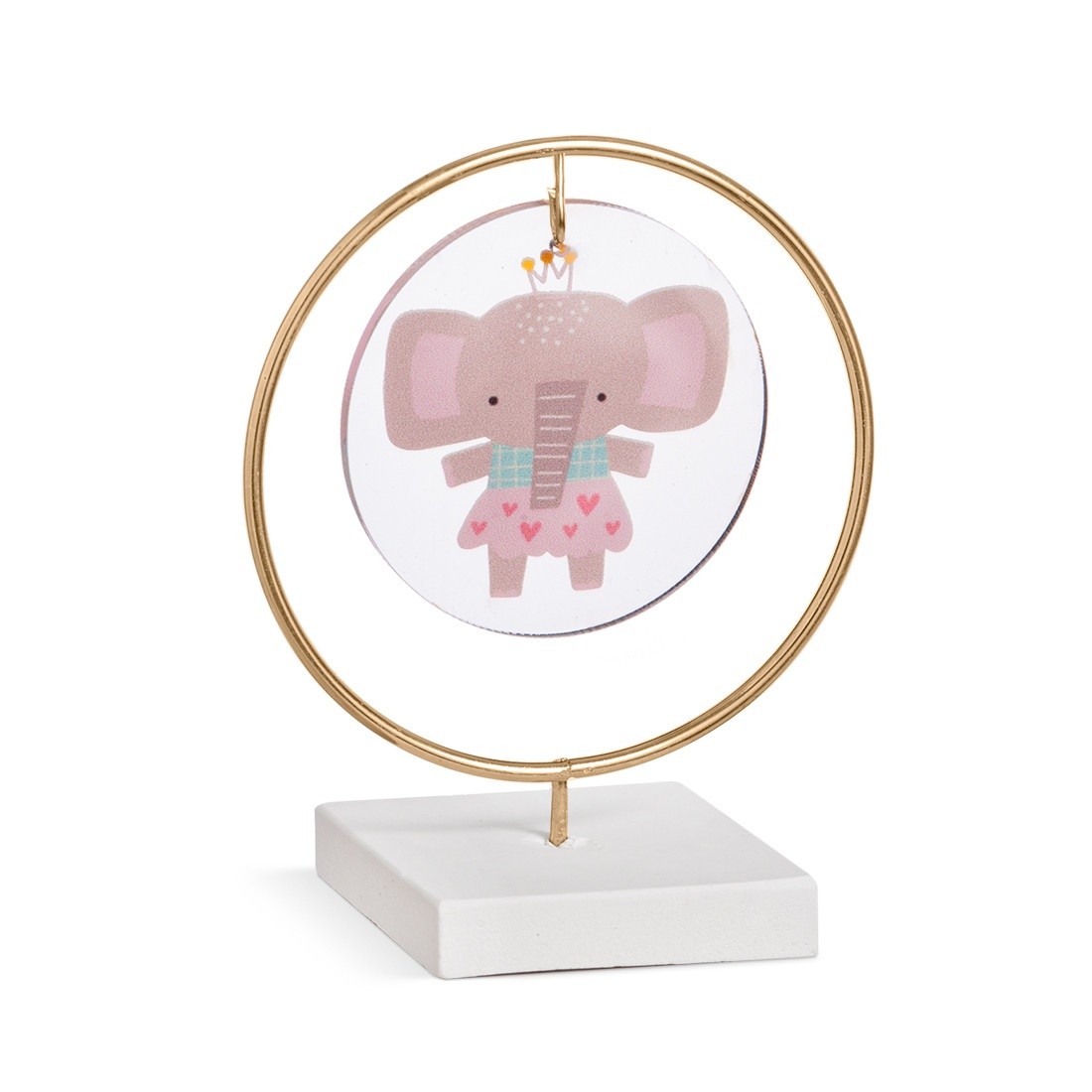 Διακοσμητική μπομπονιέρα με σύνθεση τριών υλικών.Η σύνθεση αποτελείται από : α) στρογγυλή print plexiglass παράσταση σε διάφανο χρώμα β) μεταλλικό κρίκο σε χρυσό χρώμα γ)βάση. Η παράσταση απεικονίζει την ελεφαντίνα σε ροζ αποχρώσεις .