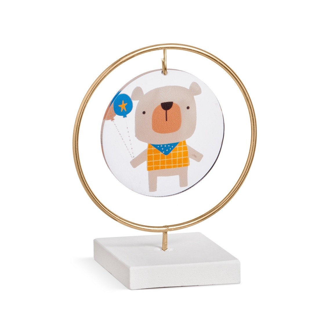 Διακοσμητική μπομπονιέρα με σύνθεση τριών υλικών.Η σύνθεση αποτελείται από : α) στρογγυλή print plexiglass παράσταση σε διάφανο χρώμα β) μεταλλικό κρίκο σε χρυσό χρώμα γ)βάση. Η παράσταση απεικονίζει το αρκουδάκι να κρατάει μπαλόνια σε σιέλ αποχρώσεις .