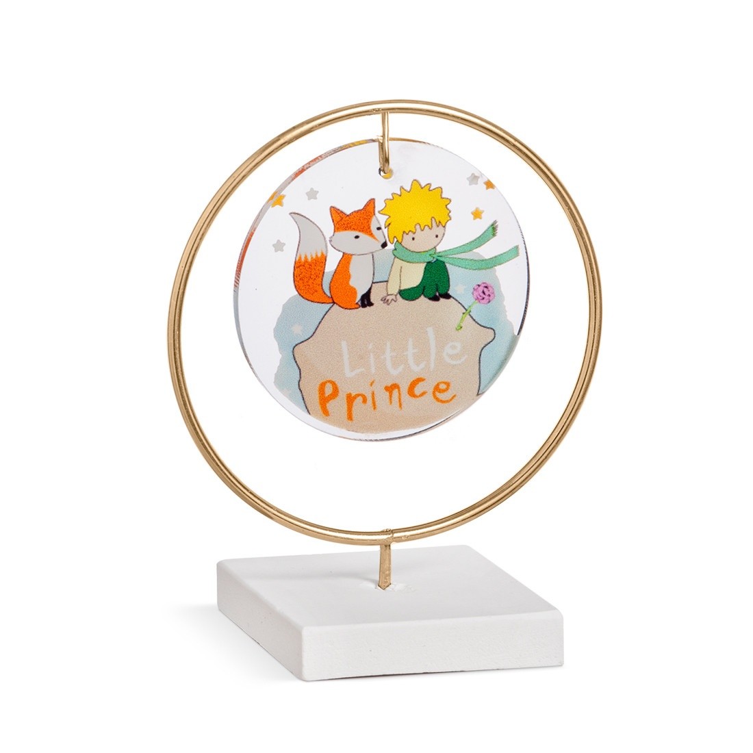 Διακοσμητική μπομπονιέρα με σύνθεση τριών υλικών.Η σύνθεση αποτελείται από : α) στρογγυλή print plexiglass παράσταση σε διάφανο χρώμα β) μεταλλικό κρίκο σε χρυσό χρώμα γ)βάση. Η παράσταση απεικονίζει την κλασσική φιγούρα του Μικρού Πρίγκιππα από το παραμύθι .