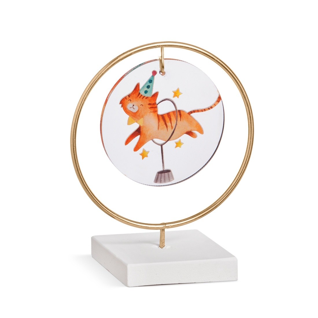Διακοσμητική μπομπονιέρα με σύνθεση τριών υλικών.Η σύνθεση αποτελείται από : α) στρογγυλή print plexiglass παράσταση σε διάφανο χρώμα β) μεταλλικό κρίκο σε χρυσό χρώμα γ)βάση. Η παράσταση απεικονίζει την τίγρη να κάνει ακροβατικά στο τσίρκο .