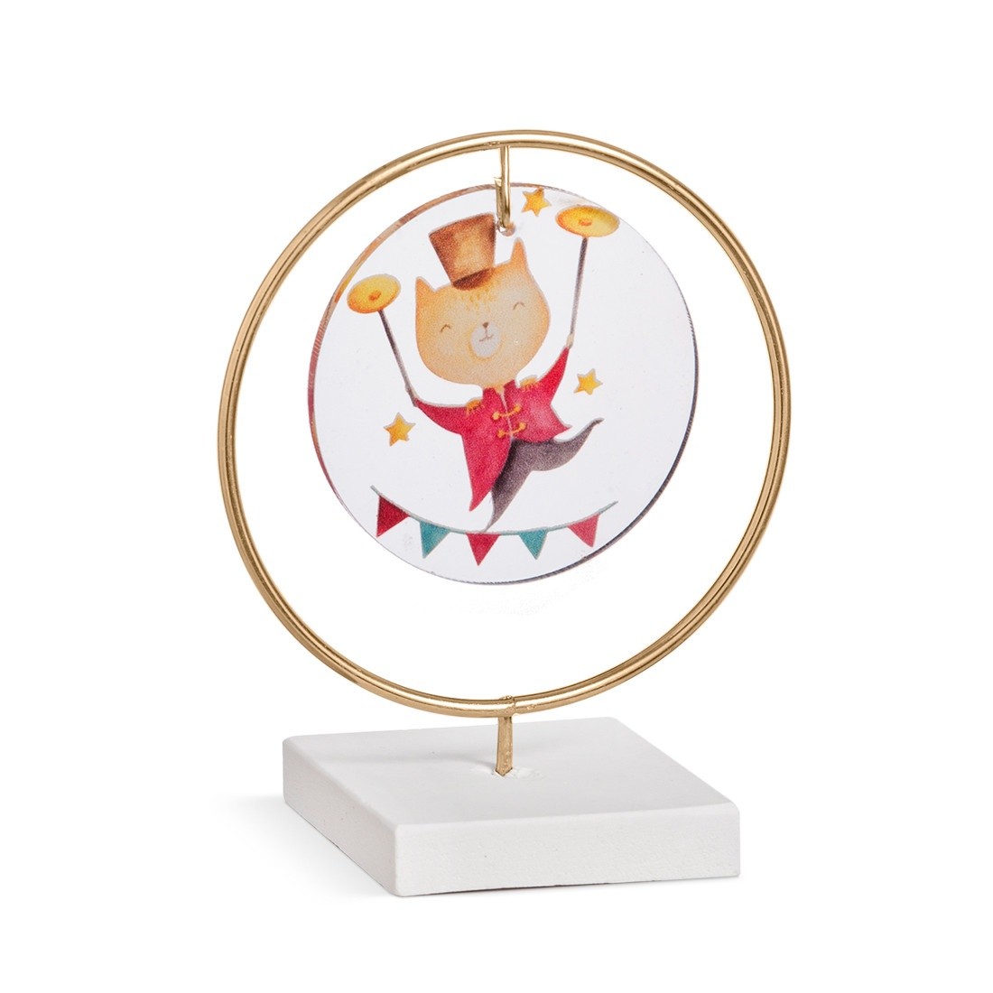 Διακοσμητική μπομπονιέρα με σύνθεση τριών υλικών.Η σύνθεση αποτελείται από : α) στρογγυλή print plexiglass παράσταση σε διάφανο χρώμα β) μεταλλικό κρίκο σε χρυσό χρώμα γ)βάση. Η παράσταση απεικονίζει την γατούλα να κάνει ακροβατικά στο τσίρκο .